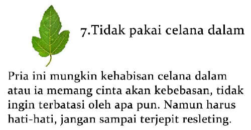 Setelah kemarin saya nge post tentang melihat keberuntungan lewat bentuk leher.. Sekarang saya mau kasih contekan buat kamu atau cowo kamu gimana sih kepribadian kamu dilihat dari celana dalam nya.. Anyway, saya copas lewat gambar jd ngetik sendiri muehehehe..